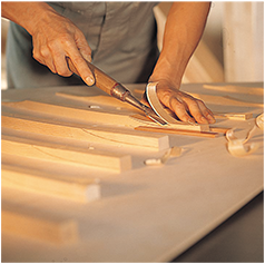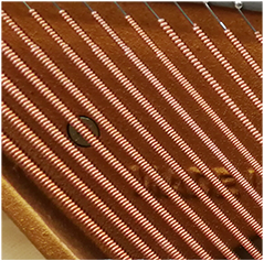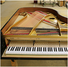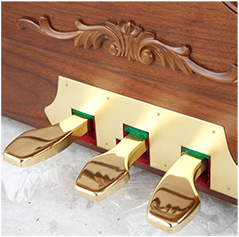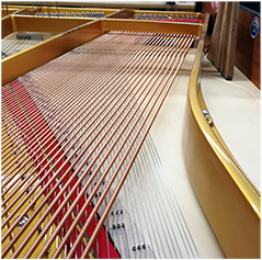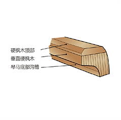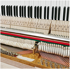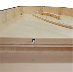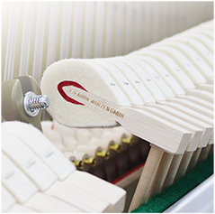 賦予鋼琴音色生命的因素中木材的選擇至關(guān)重要。而鋼琴發(fā)聲的重要因素是響板,必須使用通過(guò)內部摩擦在不消耗能量的前提下將其放射到空氣中的材料。既輕又富有彈性,能很好的傳達振動(dòng)的加拿大產(chǎn)AAA級特等白云杉木是適合扮演這種理 想的回音裝置的作用。杉木的大小需經(jīng)過(guò)嚴格的標準進(jìn)行篩選,通過(guò)充分的干燥后成為了響板的材料。一直承受琴弦壓力的響板,其彈性是含水率和溫度越低越能增加彈性,因此,為了保持響板的好的狀態(tài)保持低溫低濕度非常重要。而且,為了盡快將琴弦的振動(dòng)能量傳達到響板,使用硬楓木垂直層壓木和垂直硬楓木頂,特別是考慮了低音振動(dòng)的特點(diǎn),組合時(shí)添加了桃花心木彈性板等,篩選后在鋼琴的各個(gè)部件使用了適合的木材,以此保證鋼琴的品質(zhì)。